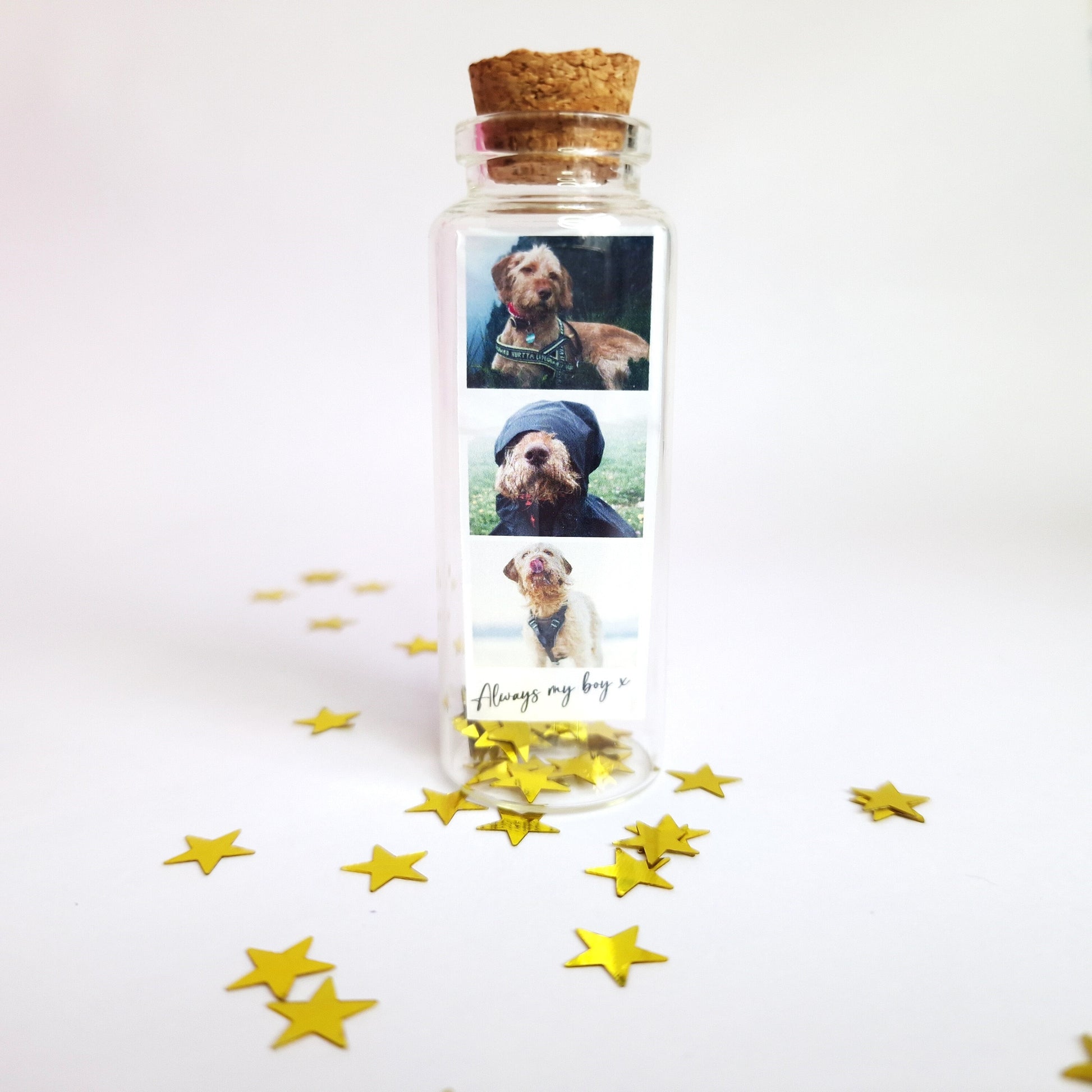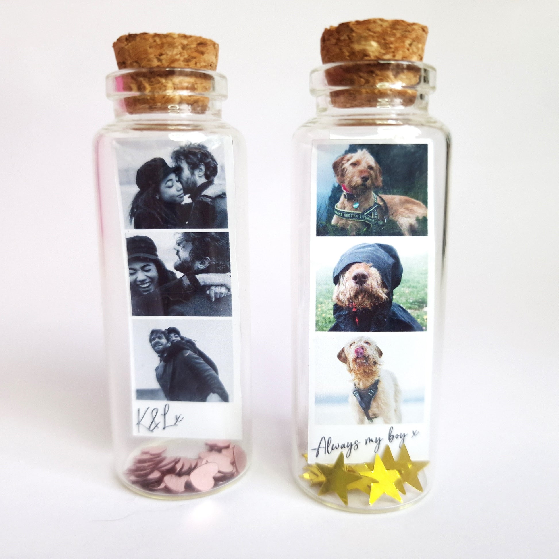 Keep your loved ones close with this beautiful mini glass bottle with your very own custom name and photo added. The perfect memory keeping gift is the perfect small keepsake to remember missed family members & pets, celebrate great friendships and relationships.
